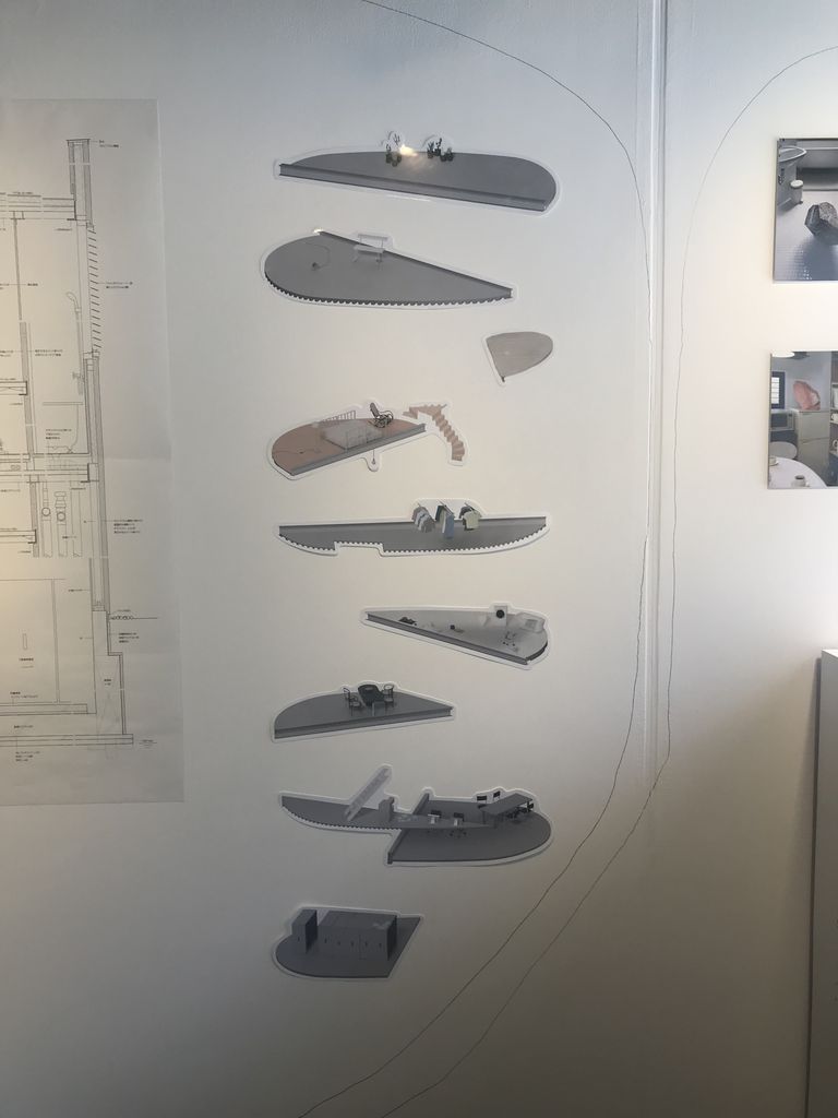孤と弦で構成された各フロア模型とその吹き抜け内部を移動するカメラ装置