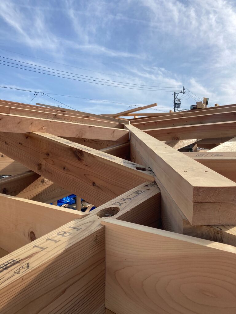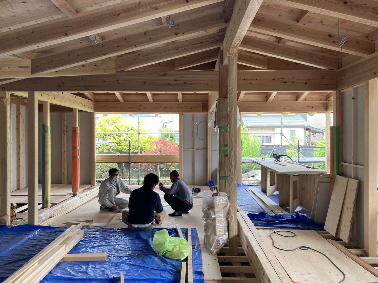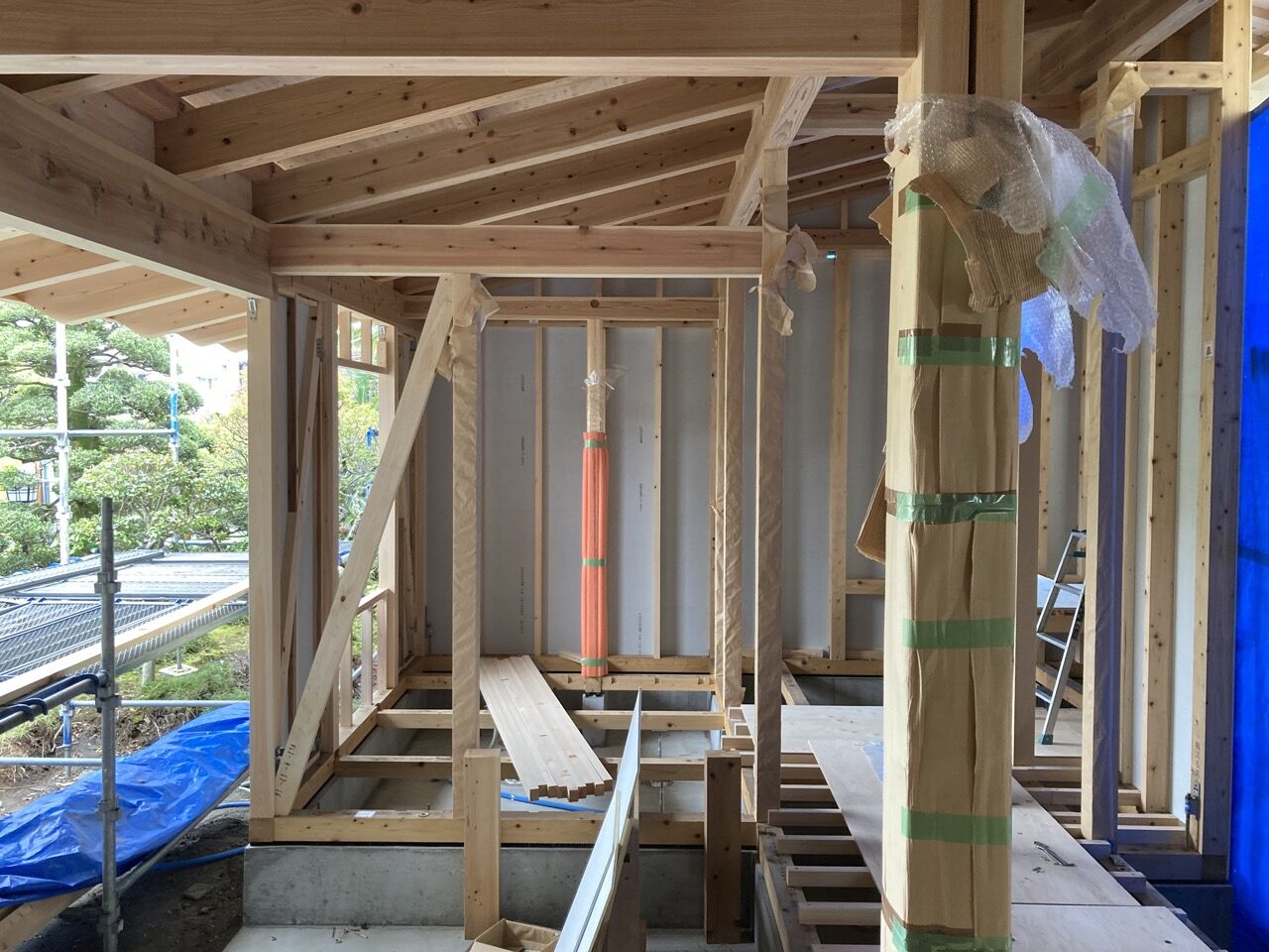 屋根の野地板、床合板、外壁廻りにも構造用合板が貼られた状態です。