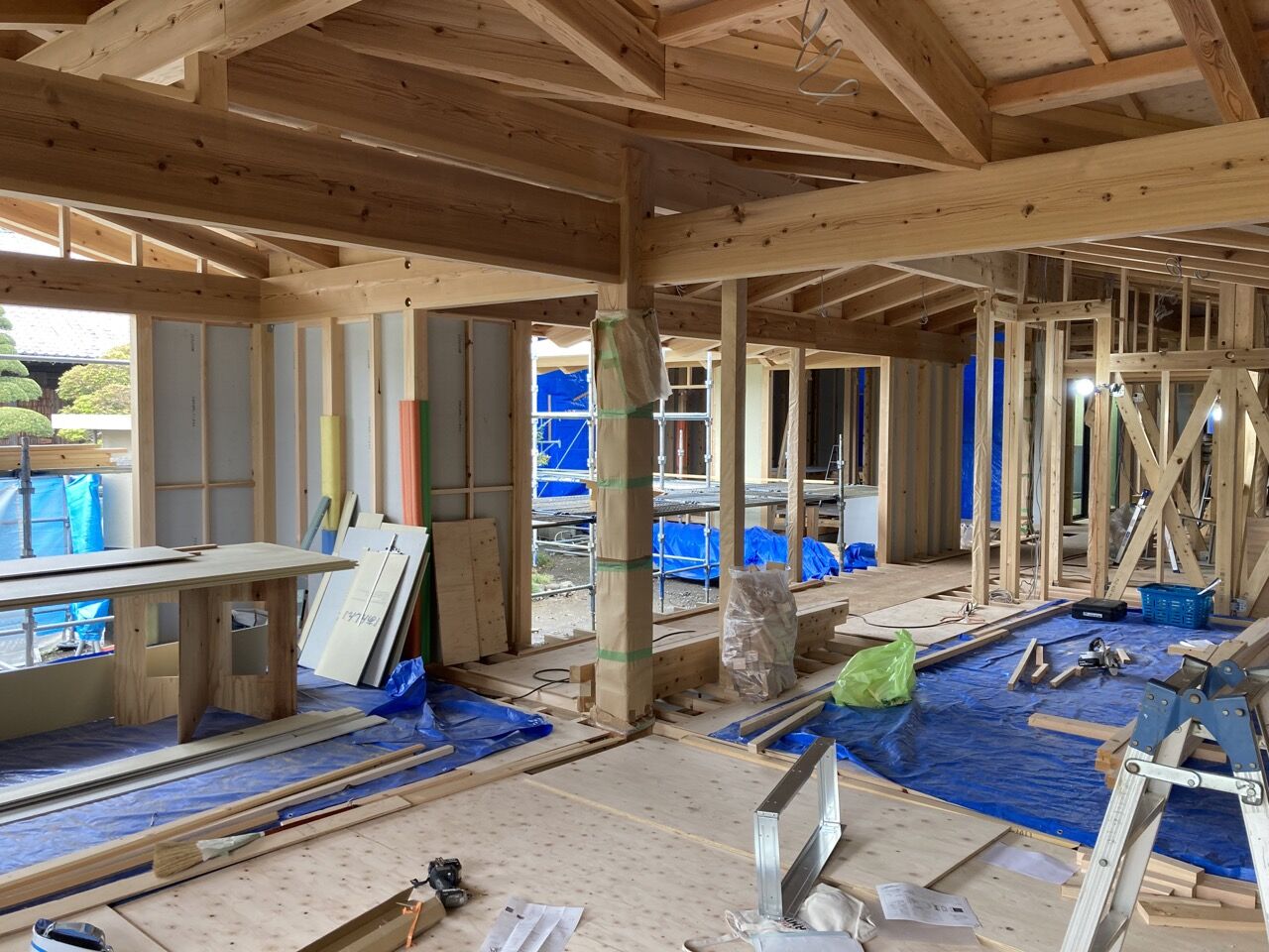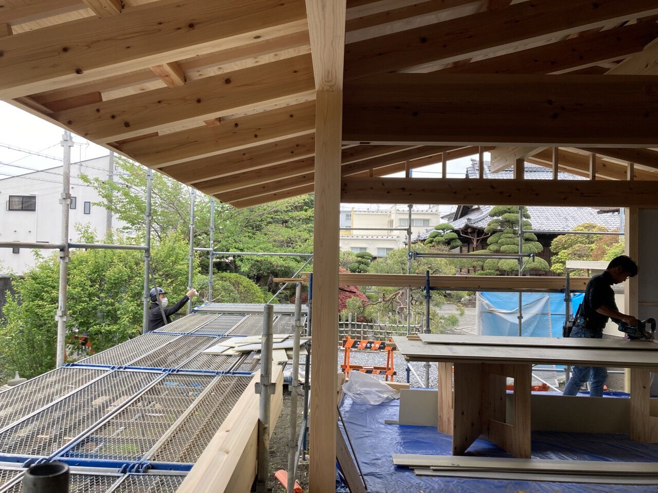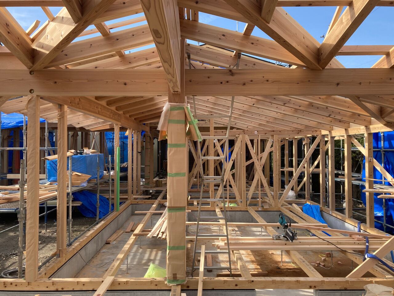 屋根の野地板、床合板、外壁廻りにも構造用合板が貼られた状態です。